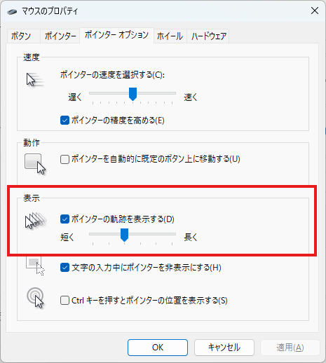 最近マウスの設定をいじった、最初から残像が残っていたみたいな場合は、シンプルにマウスの設定として表示されている可能性があります。